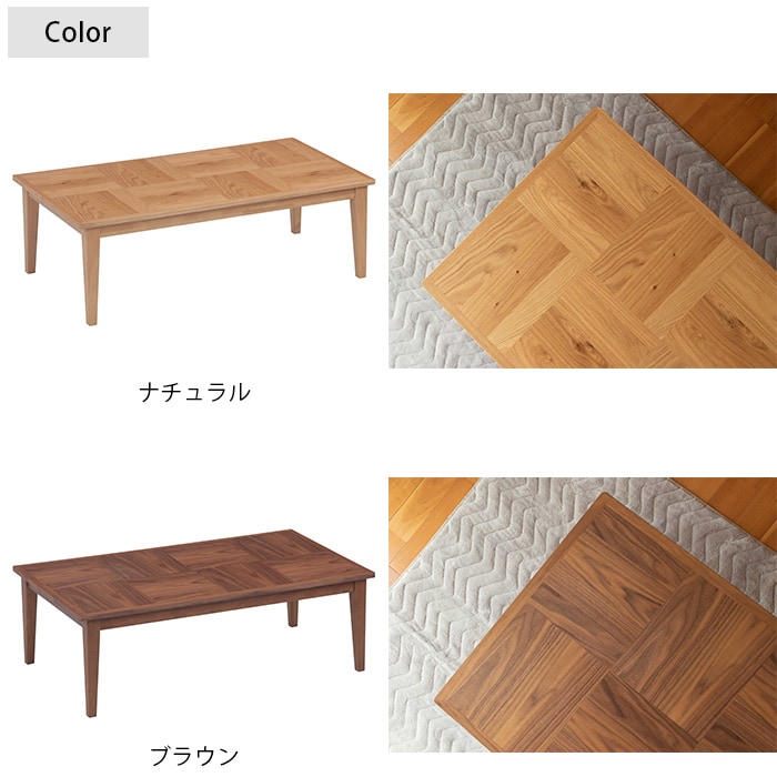 モザイク調に貼り合わせた木目天板がポイントに。ナチュラルにはオーク、ブラウンにはウォルナット突板を使用しています。