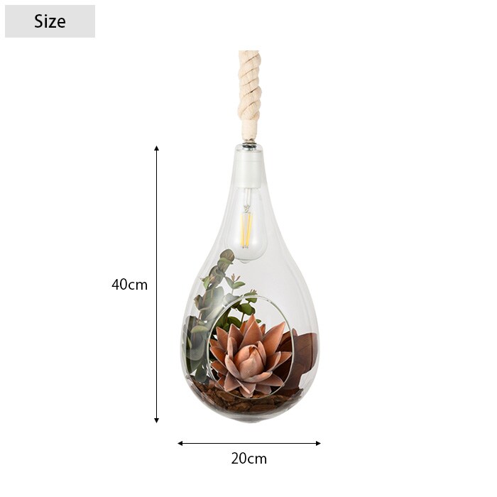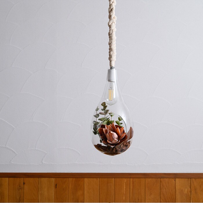 リアルなフェイクグリーン、しずく型のガラス、コットンコードと、細かい部分にこだわり感のあるおしゃれな照明です。