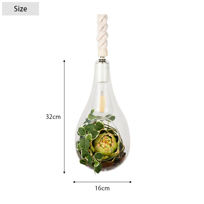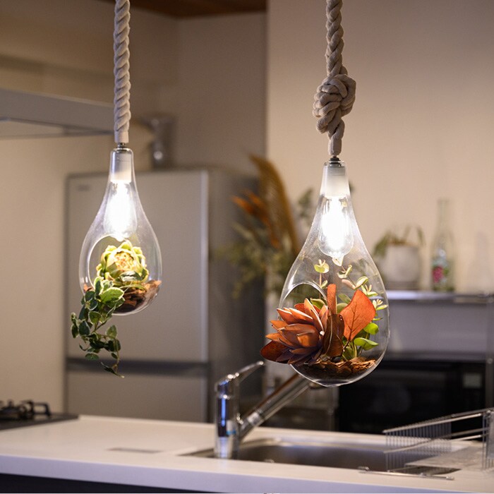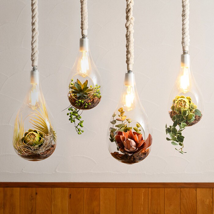 リアルなフェイクグリーン、しずく型のガラス、コットンコードと、細かい部分にこだわり感のあるおしゃれな照明です。