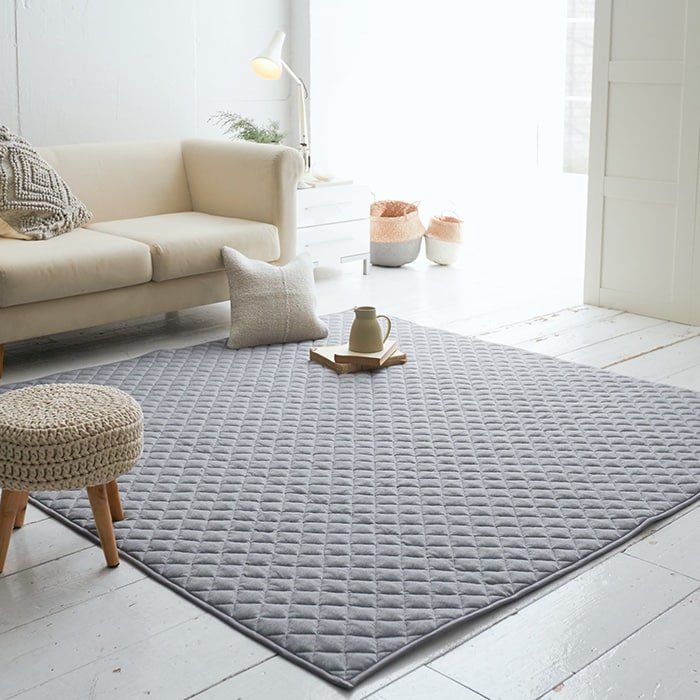 裏面ゴム付きでアンダーラグに引っかけられ、洗濯機で丸洗いできるので、ペットや子供のいる空間におすすめです。