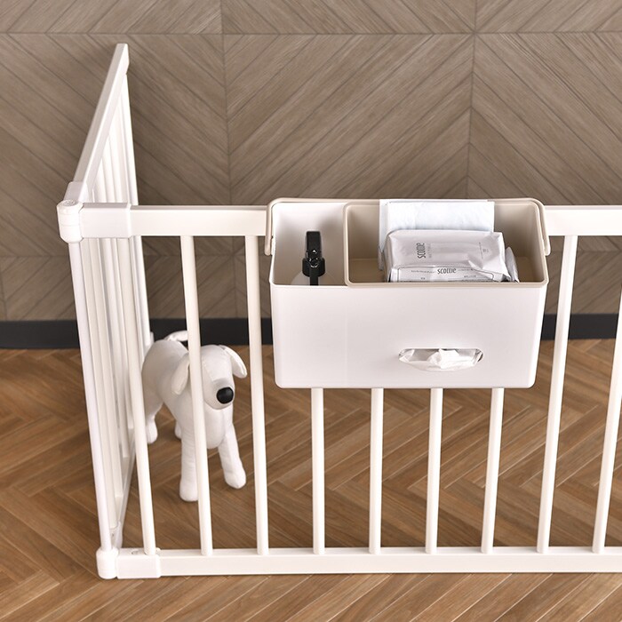 ペットや赤ちゃんのお世話グッズをまとめて収納できるオーガナイザー。 インテリアにとけこむシンプル&シックなカラーリング。 サークルやフェンスに掛けて使え、持ち運びできるハンドル付きの機能的なデザインです。