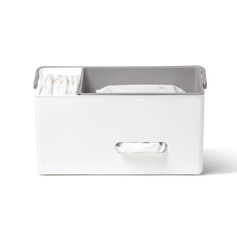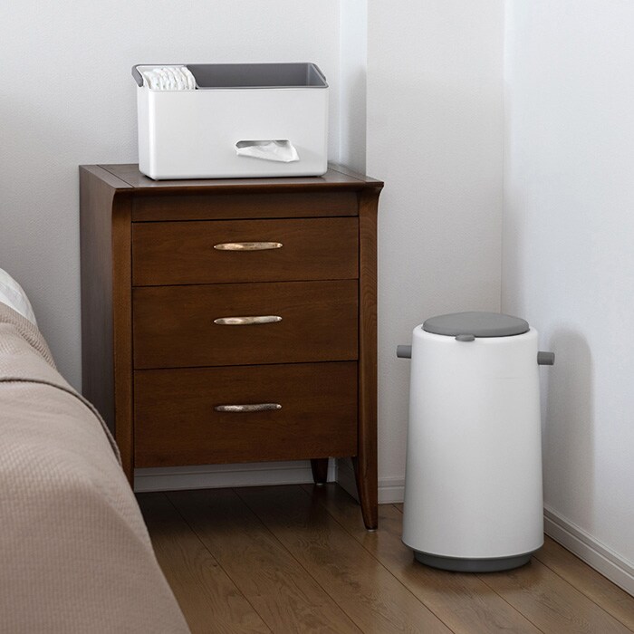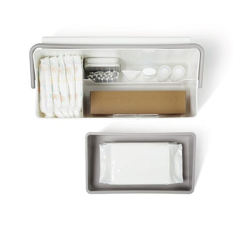 赤ちゃん約1日分のおむつ、おしりふき、ティッシュペーパー、綿棒などをひとまとめに収納できます。