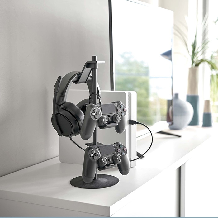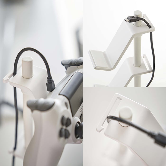 高さと向きを自由に調整できるので、様々な種類のコントローラーやヘッドセットが収納できます。
