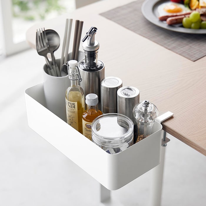 テーブル上の細々した小物・カトラリー・調味料ボトルを整理整頓。テーブルを拭いたり、食事をする時も広く使えて便利です。