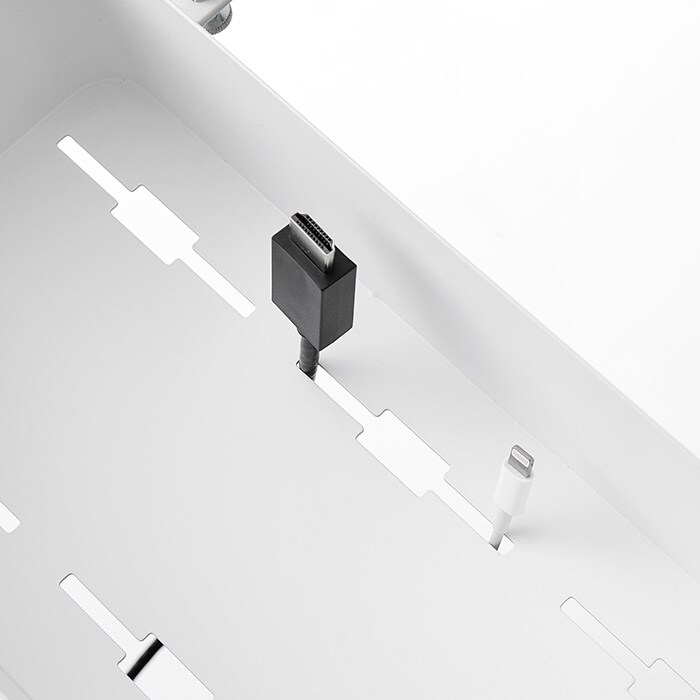 調節ネジで簡単設置。天板の厚さ1.2cmから5cmに対応。 浮かせることで場所をとらずお手入れしやすいく、ソファやチェアのアームレスト、デスク等に取り付けてご使用いただけます。