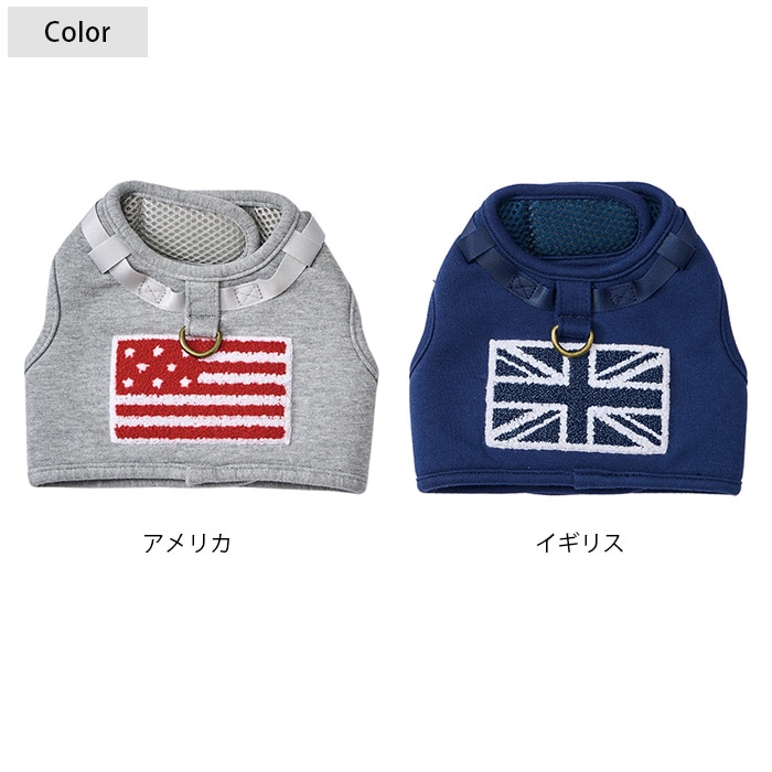 大きな国旗の刺繍がインパクト大な、犬用のウェアハーネス。