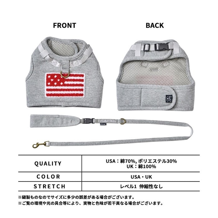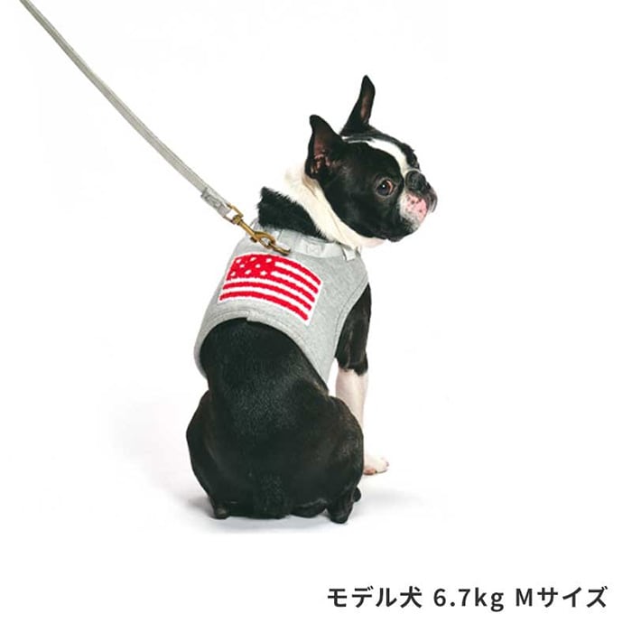 大きな国旗の刺繍がインパクト大な、犬用のウェアハーネス。