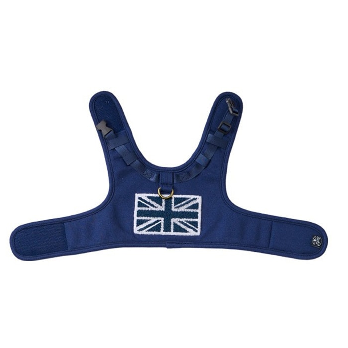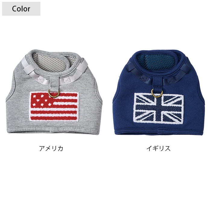 大きな国旗の刺繍がインパクト大な、犬用のウェアハーネス。