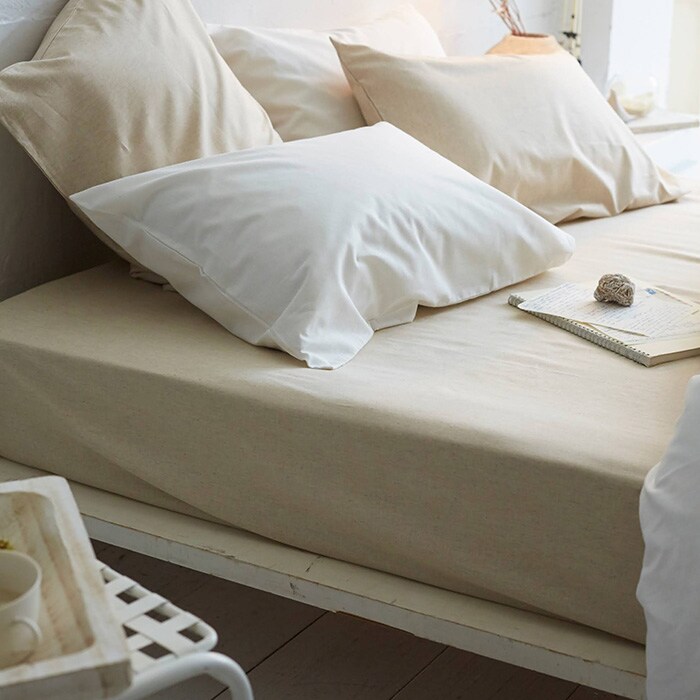 コットンのやわらかな風合いとリネンの上品なさわやかさをミックスしたクィーン用ボックスシーツ。