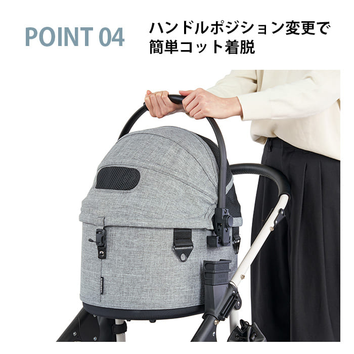 ボタンを押してキャリーハンドルのポジションを変えることで、簡単にコットの着脱が可能です。