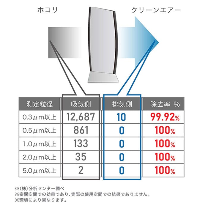 空気中のダニやカビなどの微粒子を99%以上除去したことが実験により確認されています。
