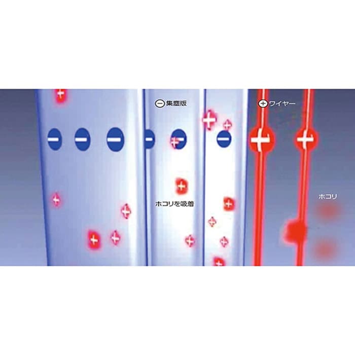 ホコリを強制的に+(プラス)に荷電し、-(マイナス)に荷電した集塵板に吸着。