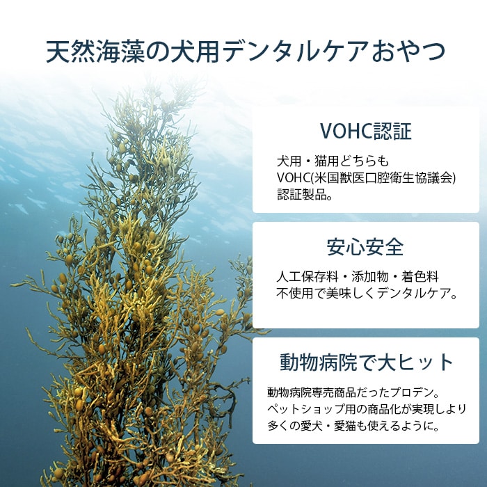 天然海藻(アスコフィラノドサム)を主原料とする安全な犬用のデンタルケアおやつです。