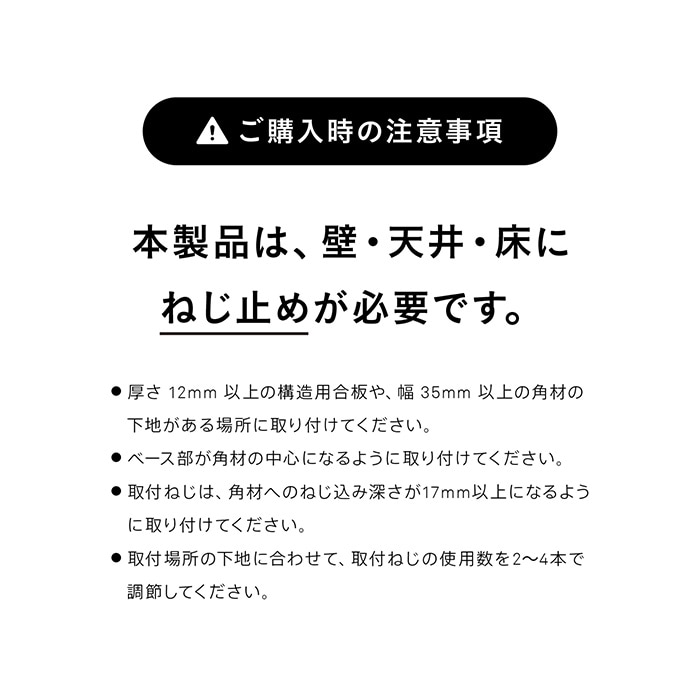 ・厚さ12mm以上の構造用合板や、幅35mm以上の角材の下地がある場所に取り付けてください。