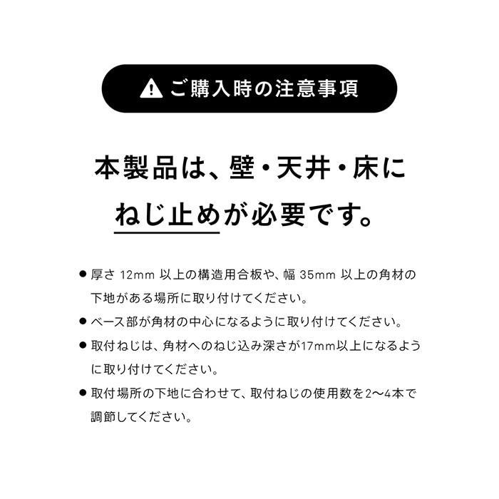 ・厚さ12mm以上の構造用合板や、幅35mm以上の角材の下地がある場所に取り付けてください。