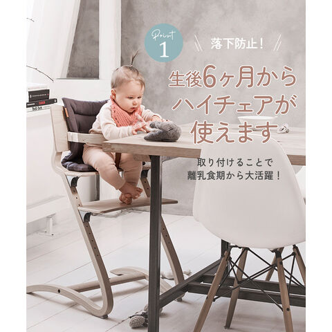 お子さまがハイチェアから滑り落ちないように、しっかりとサポートしてくれます。こちらを取り付けることで生後6ヶ月頃からハイチェアをお使いいただけます。 また、このセーフティーバーは、お子さまの成長に合わせて2段階に調節することが可能です。 ※ハイチェア(別売り)を安全にお使いいただくために、生後6ヶ月から2歳頃までのお子さまは、本品を必ず使用してください。