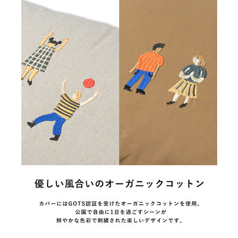 公園の風景を鮮やかな色彩で刺繍した、楽しいデザインのクッション。