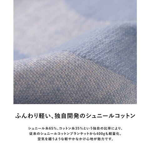シュニール糸65%、コットン糸35%という独自の比率により、従来のシュニールコットンブランケットから400gも軽量化。