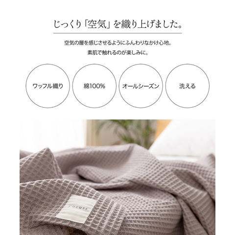 じっくり「空気」を織り上げた『ワッフルケット シングルサイズ』です。空気の層を感じさせるように、ふんわりやさしいかけ心地。素肌で触れるのが楽しみになる肌ざわりです。夏はさらり、冬はほっこりで、オールシーズンお使いいただけます。