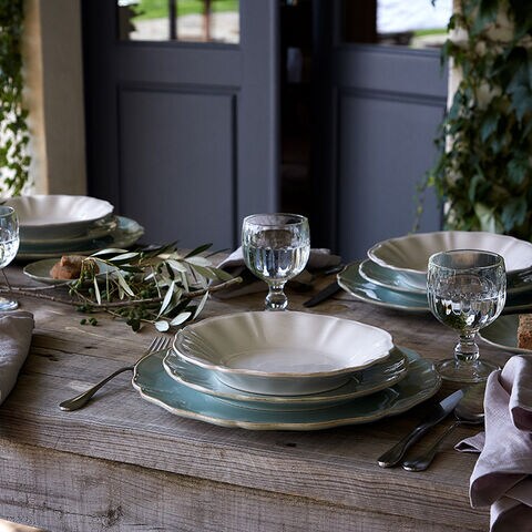 パンとワイン、大きめに切った野菜の煮込み料理やパスタなど、ヨーロッパの素朴な家庭料理が並ぶ食卓にぴったりの一枚。様々なテーブルウェアにもうまく馴染み、食卓に温かくほんのりロマンチックな気持ちを添えてくれるアイテムです。
