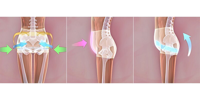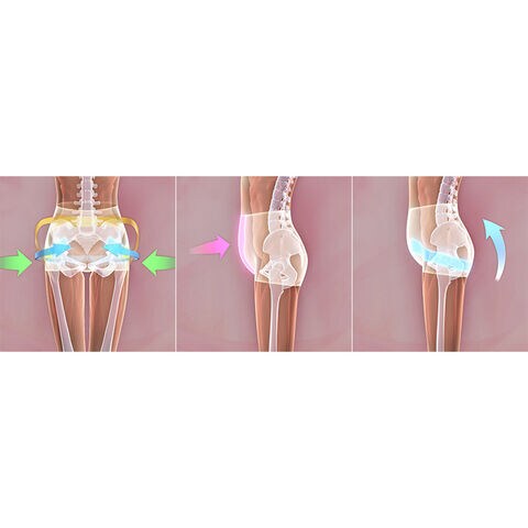日本人女性の9割以上が骨盤まわりが歪んでいると言われています。前傾タイプの歪みには、お腹パネルで前に傾いた骨盤を垂直に。後傾タイプの歪みには、お尻ベルトで後ろに傾いた骨盤を垂直に。左右タイプの歪みには、クロスベルトでサイドから中央に寄せることで骨盤ケアと体型補整を叶えます。毎日忙しいあなたに、頑張らなくていい骨盤ケアをお届けします。