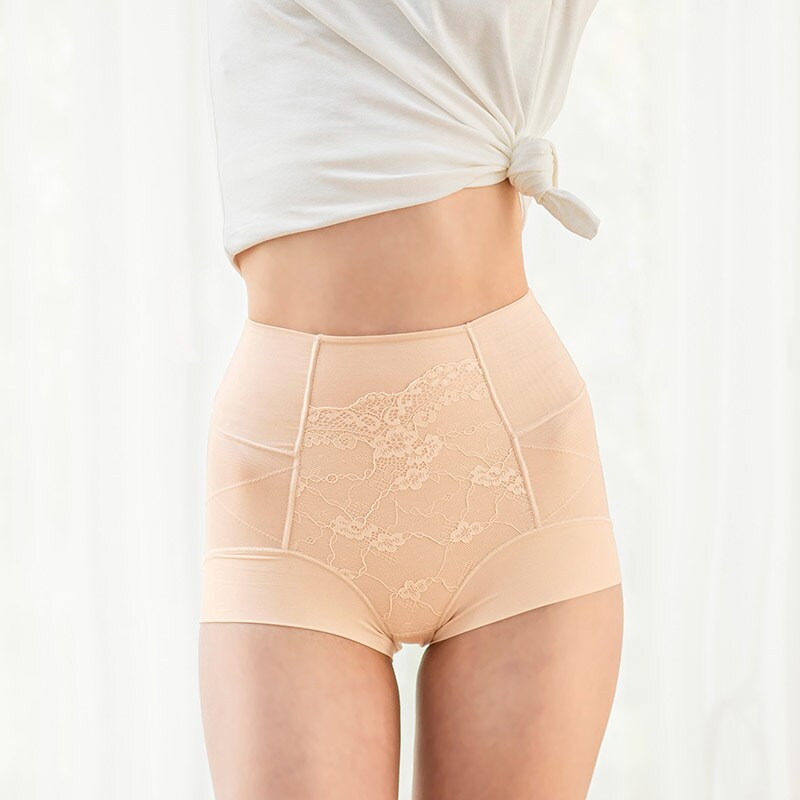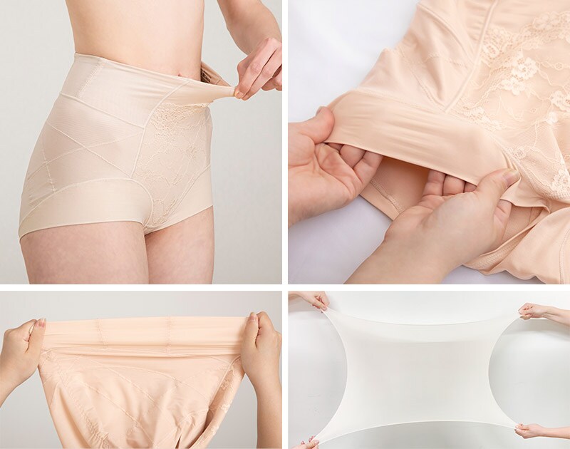 従来品に補整ラインを1本プラスして、3本の補整ラインとお腹パネルで肉感をおさえ、きれいな補整を実現しました。