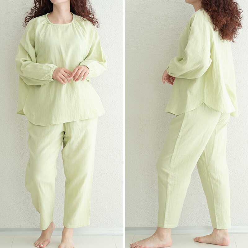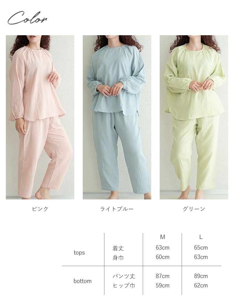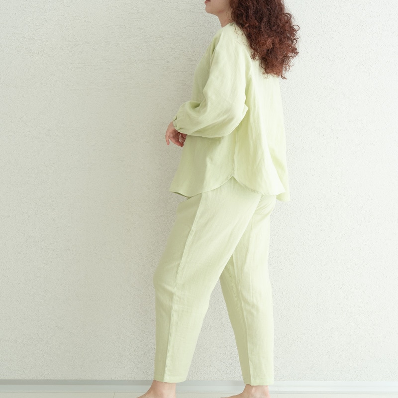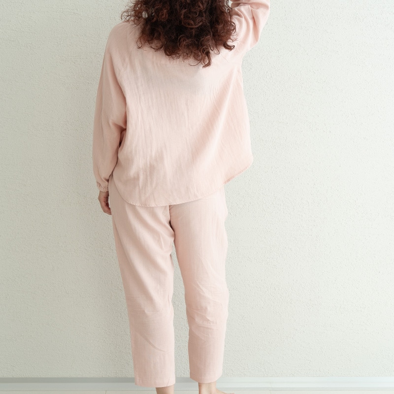 しっとりとやわらかなWガーゼに天然由来成分をプラスした「着る保湿クリーム」のスリーピングウェア。トップスはゆったりとしたプルオーバータイプで、襟ぐり・袖口にはゴムが入っており着用もラクラク。ボトムスはすっきり履けるテーパード型でウエストには調整可能な紐がついています。飽きのこないシンプルデザインで、洗濯しても効果が持続するので、長くご愛用いただけます。