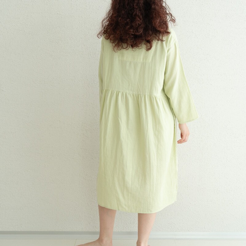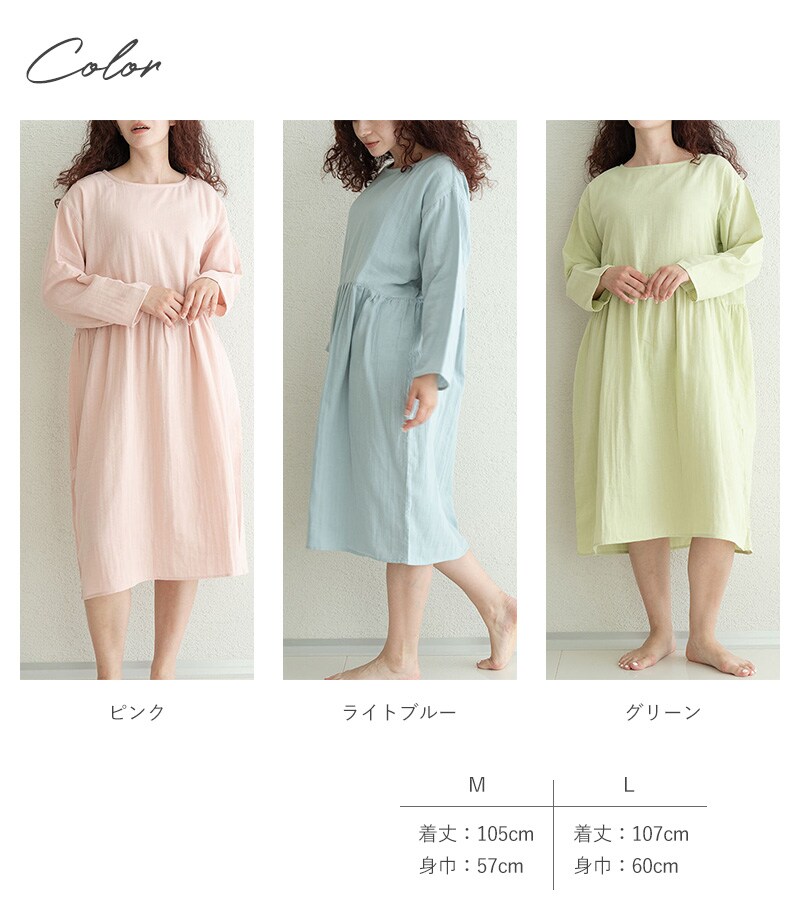 着る保湿クリーム 長袖ウエストギャザー切替ワンピース グリーン L D93503-56 パジャマ ルームウェア レディース 保湿 乾燥肌 ガーゼ素材 綿100%