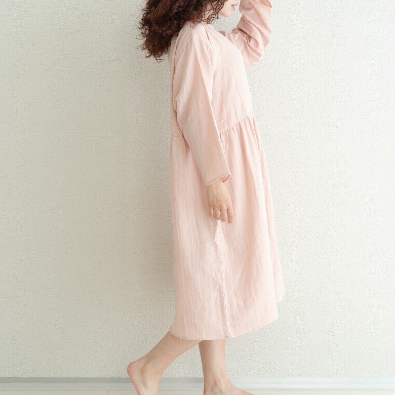 しっとりとやわらかなWガーゼに天然由来成分をプラスした「着る保湿クリーム」のスリーピングウェア。お風呂あがりに着るだけで、湯冷めとお肌の乾燥からしっかり守ってくれる、ゆったりとしたシルエットがポイントのワンピースが登場。ウエストのギャザー切替えデザインがかわいらしい一枚です。飽きのこないシンプルデザインで、洗濯しても効果が持続するので、長くご愛用いただけます。