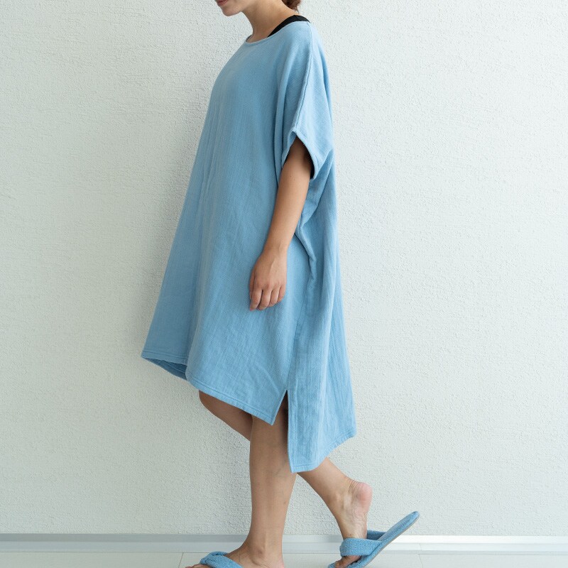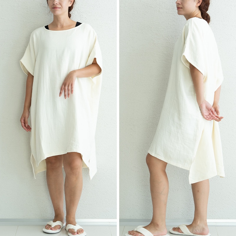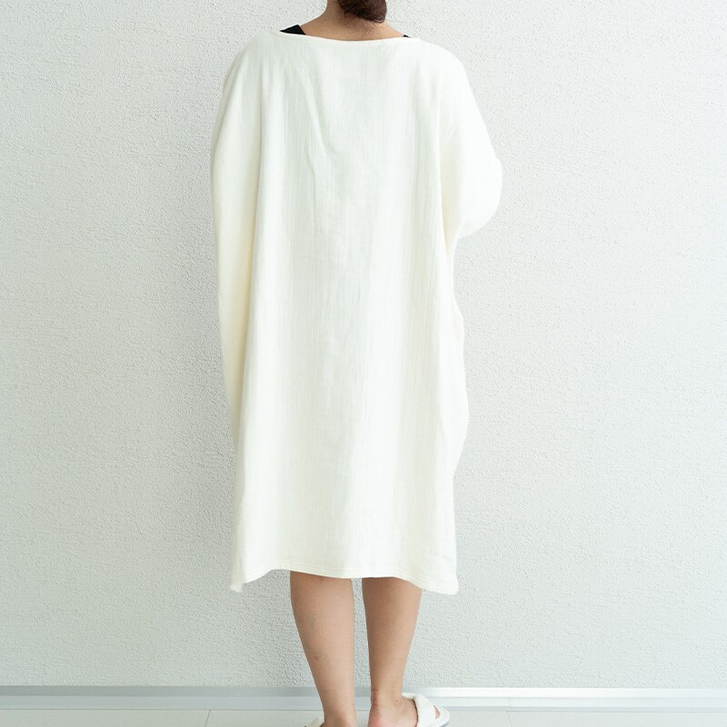 内側には吸水性の高いパイル素材を採用。水分率の高い生地を使用し包み込むような着心地と軽やかさで、乾燥の季節も快適に過ごせるやさしいワンピースです。