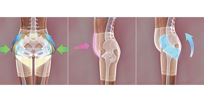 骨盤まわりの補整力はそのままに、圧着部位はシームレス仕様で至極のはき心地の下着が新登場。素材の違う3つの補整パーツで骨盤を正しい位置に導きながら肉感をおさえ、きれいな補整を実現しました。