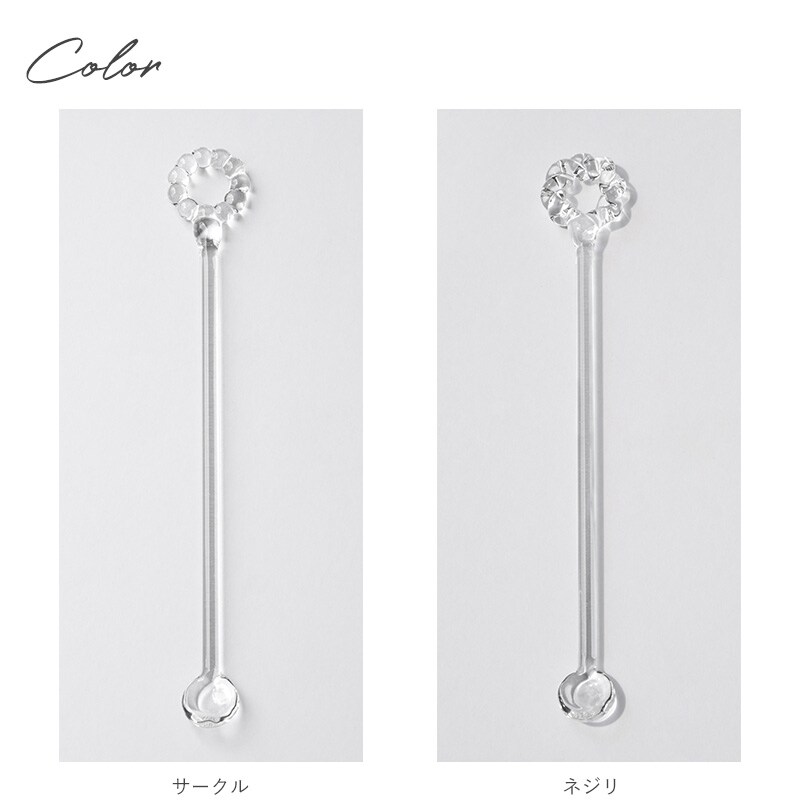 先端のかたちが定番アクセサリーの「サークル」と「ネジリ」になっている、まるでアクセサリーのようなガラスのマドラー。いつものドリンクが高見えするような、目でも楽しめるアイテムです。