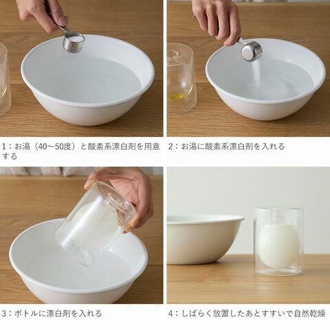 お湯(40~50℃程度)に酸素系漂白剤を少し入れて漂白剤を作り、ボトルの中に漂白剤を入れてしばらく放置していただき、その後は水でよくすすいで洗い流し、自然乾燥させてください。