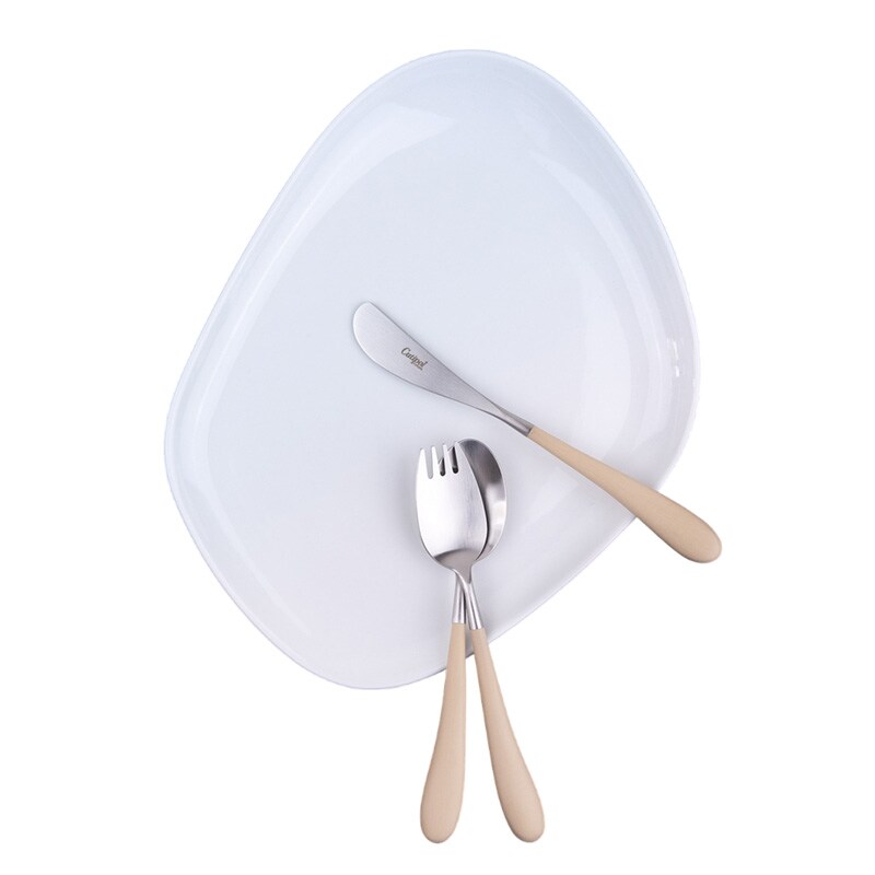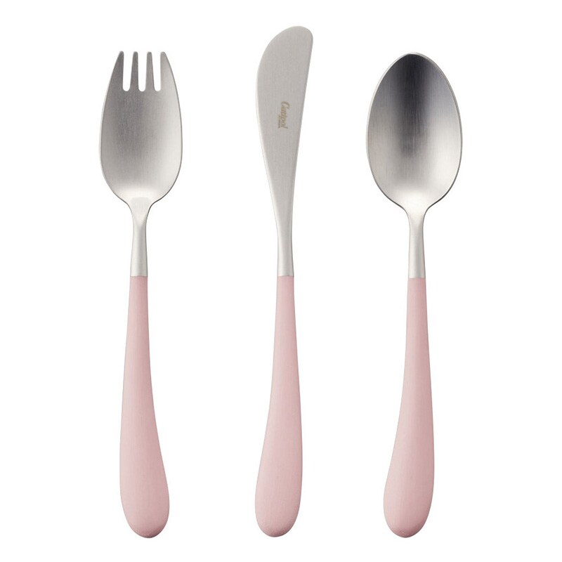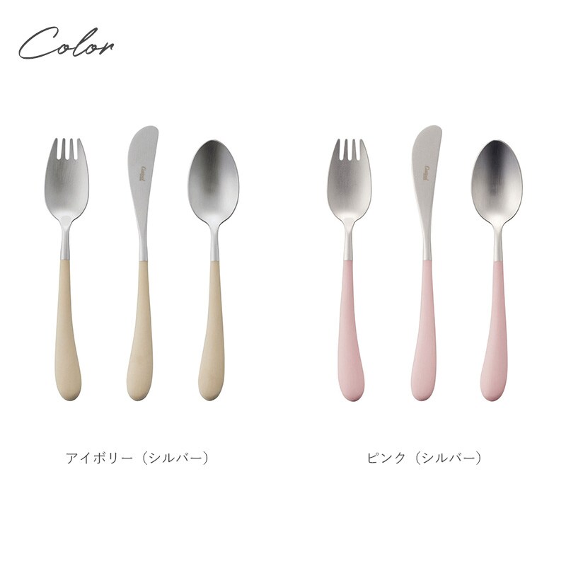 5 6歳のお子さまの手にフィットするサイズ感のフォーク・ナイフ・スプーンの3本セット。ナイフは安全性を考慮して切れ味を抑えており、バターやジャムを塗る用途にもぴったり。大人になってからもデザートスプーンやバターナイフとして活躍します。