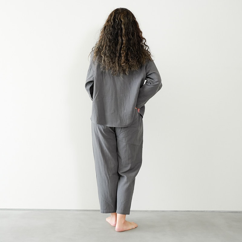 しっとりとやわらかなWガーゼに天然由来成分をプラスした「着る保湿クリーム」のパジャマ。幅広い年齢の方が着用しやすい前開き仕様で、小さめのショールカラーがかわいらしい雰囲気に。ボトムスはすっきり履けるテーパード型でウエストには調整可能な紐がついています。飽きのこないシンプルデザインで、洗濯しても効果が持続するので、長くご愛用いただけます。