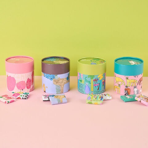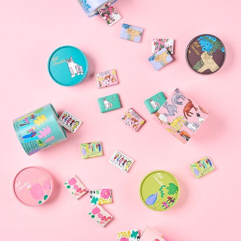 2種類のアートワークがひとくちチョコのパッケージになっています。かわいさ溢れるパッケージはもちろん、素材や製法にこだわって作る、中身のフェアトレードチョコレートも魅力たっぷり。乳化剤不使用なリッチで上品な甘みのミルクチョコレートがお楽しみいただけます。