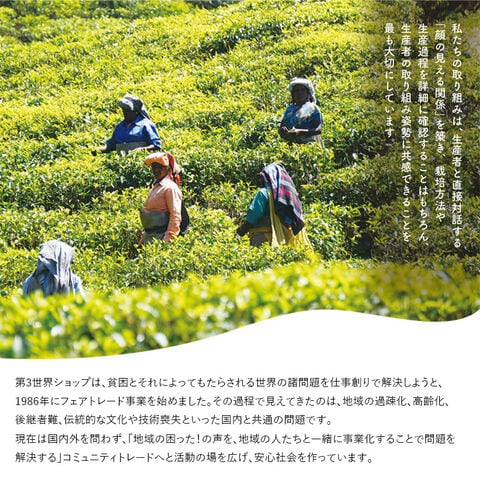 第3世界ショップは、1986年に始めたフェアトレードを経て、国内外を問わず、地域の力で諸問題の解決を目指すコミュニティトレードへと、活動の場を広げています。原材料・製法にこだわった食品と、フェアトレードの雑貨類を輸入販売しています。