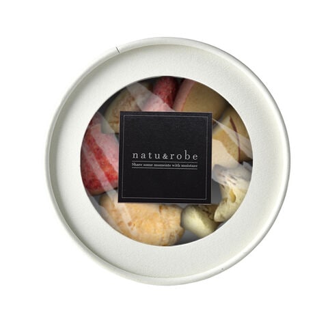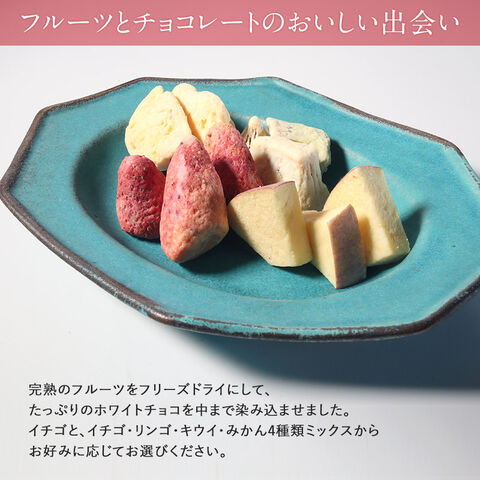 爽やかな果実にホワイトチョコレートをぎゅっとしみ込ませた新感覚のチョコレートです。イチゴと、イチゴ・リンゴ・キウイ・みかん4種類ミックスからお好みに応じてお選びください。食べ頃の時期に収穫しフリーズドライ、独自製法でチョコレートをしみ込ませ、しっとりサクッとした味わいに仕上げました。