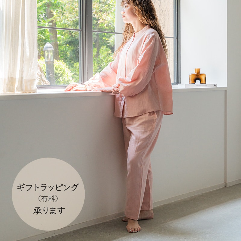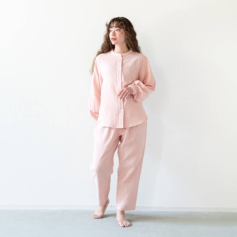 しっとりとやわらかなWガーゼに天然由来成分をプラスした「着る保湿クリーム」のパジャマ。幅広い年齢の方が着用しやすい前開き仕様で、袖口にはゴムが入っているので腕まくりがしやすく便利です。ボトムスはすっきり履けるテーパード型でウエストには調整可能な紐がついています。洗濯しても効果が持続するので、長くご愛用いただけます。