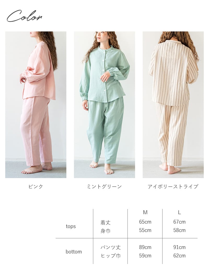 就寝後に汗をかくことで体温を調整し深い眠りにつくことができます。吸湿性があり通気性のいい綿100%のガーゼ素材は就寝中も快適な眠りをサポートします。また、締め付けの少ないゆったりとしたシルエットで、ストレスのない寝返りが叶います。