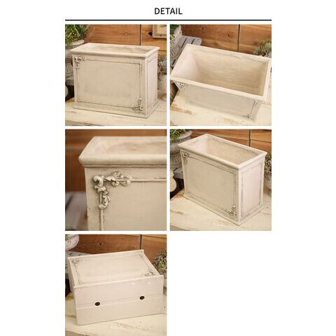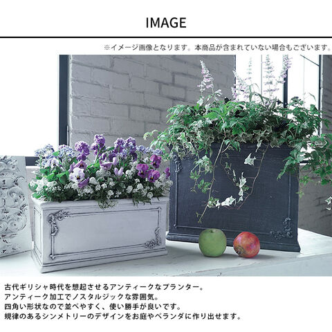 備考:古代ギリシャ時代を想起させるアンティークなプランター。アンティーク加工でノスタルジックな雰囲気。四角い形状なので並べやすく、使い勝手が良いです。規律のあるシンメトリーのデザインをお庭やベランダに作り出せます。