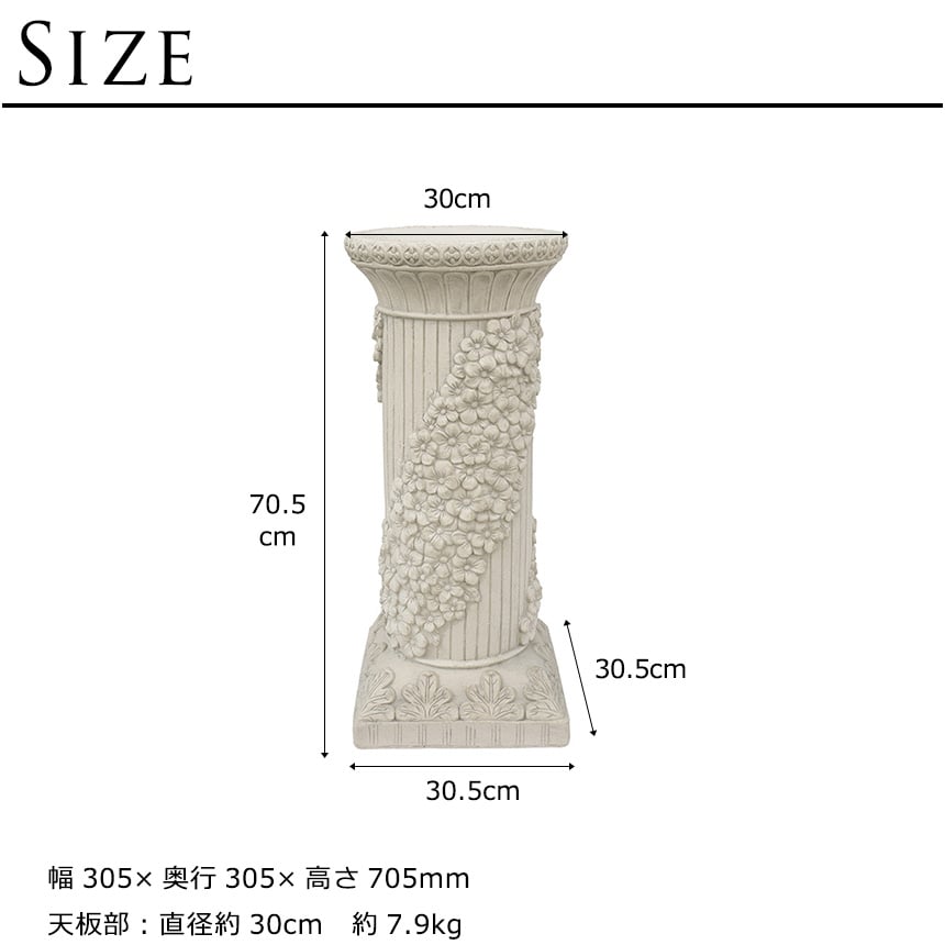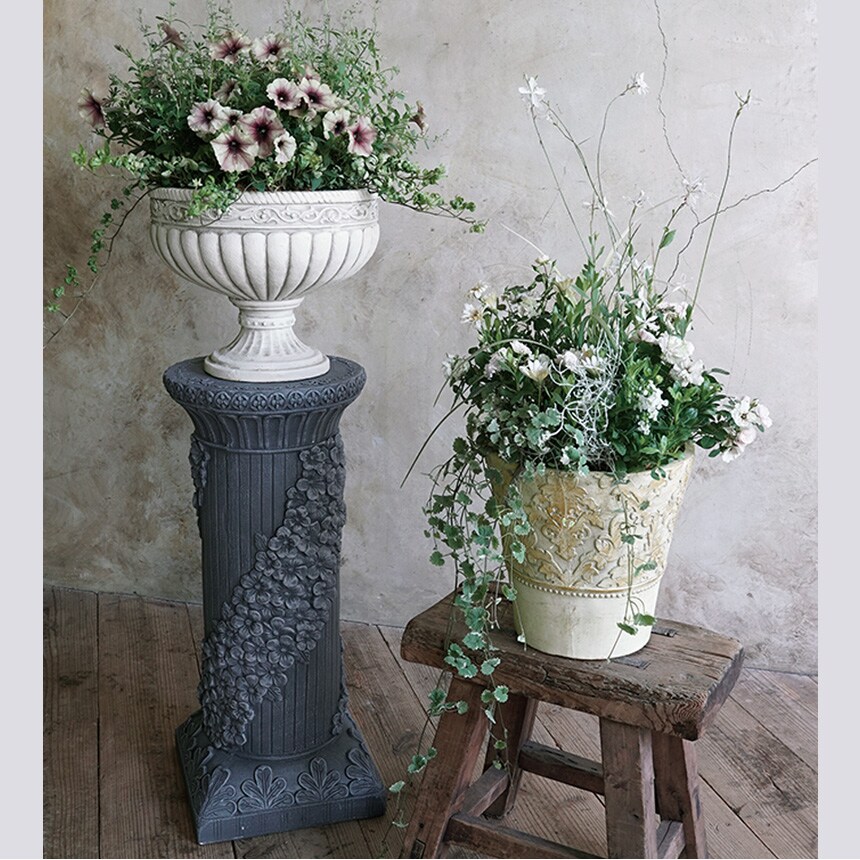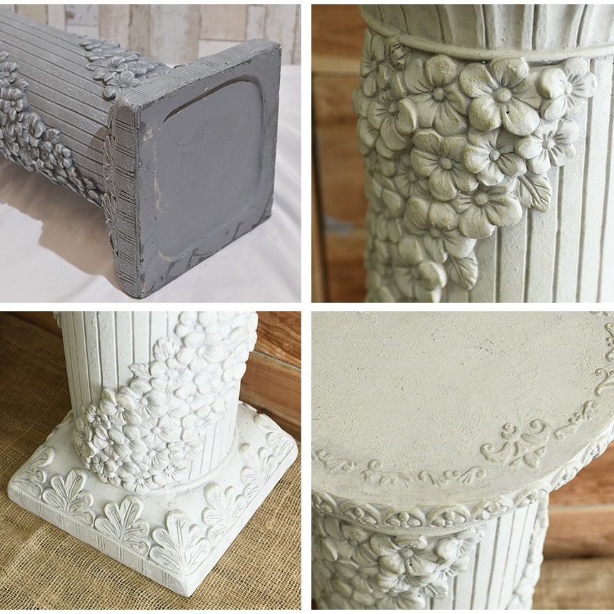 備考:あまりにも繊細で美しいデザインで見とれてしまいます。 通常は花台としての仕様ですが、このアイテム単体だけで絵になります。 神殿コラムを設置すれば、すぐに周りはギリシア神話の時代にタイムスリップ。 その美しさにつられ、神々がうっかりと顕現してしまうかもしれません。 ご自宅の玄関やガーデニングにはもちろん、 教会、結婚式場、イベントの会場などにもオススメです。