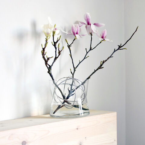 花瓶そのものの美しさはもちろん、ボリュームが多くても少なくても、簡単にきれいに活けられるのは嬉しいポイントです。スチールボールのメタリック感がスタイリッシュな雰囲気を添えて、アレンジメントを格上げしてくれます。