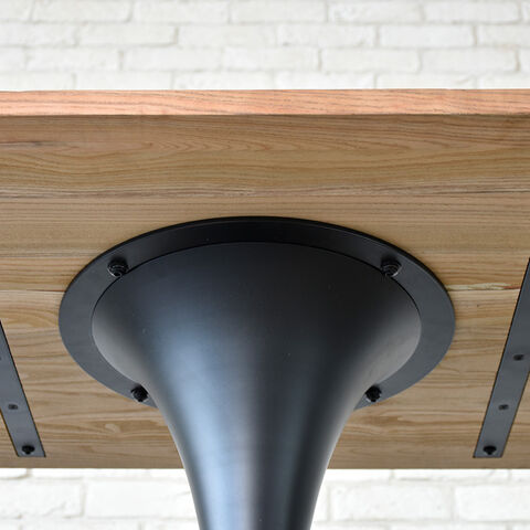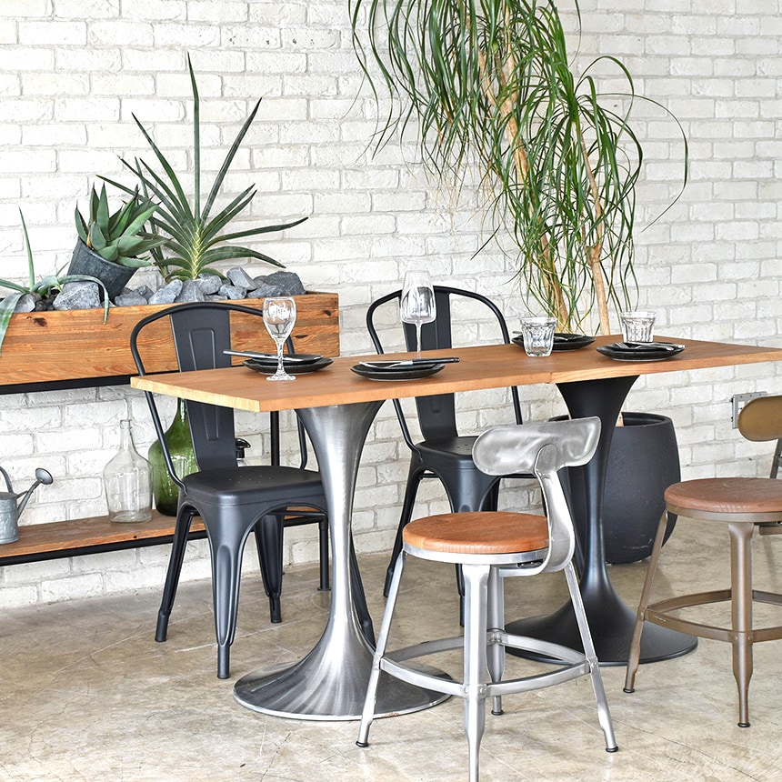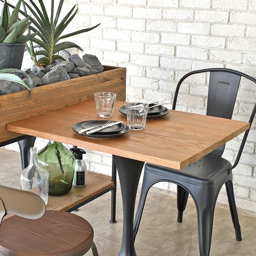 天然木の天板とスタイリッシュなスチールの脚部が特徴的なデザインのスクエアテーブル。