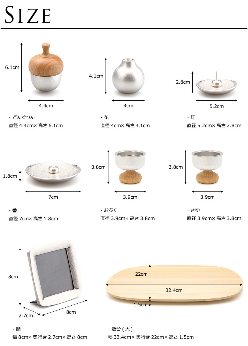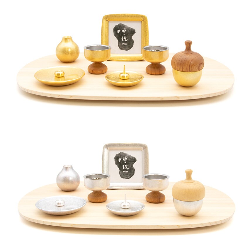 柔らかな曲線で作られた癒しと祈りの道具「まどかごくうセット」。どんぐりん(おりん)、仏飯器、茶湯器、香、灯、花、額、敷台の8点セットです。「香・花・灯・水・食」の揃った本格的な五供(ごくう)の設えが整います。