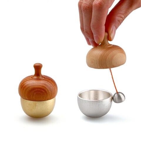 どんぐりん:どんぐりの中にしまわれた振り子でおりんを鳴らします(特許出願中)。振り子で鳴らす動作は、丁寧で心落ち着くひとときを感じさせてくれます。可愛らしいデザインにマッチした澄んだ明るい音色です。
