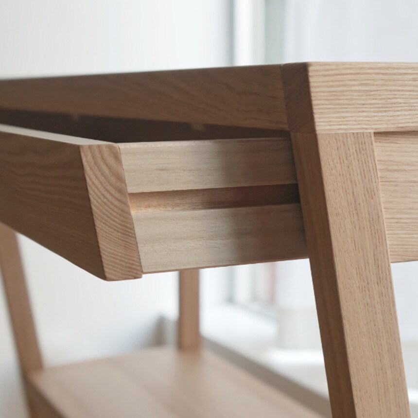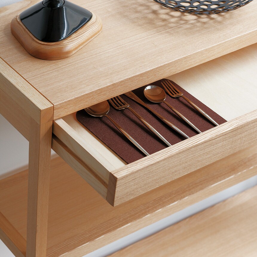 天板下には薄い引き出しが付いており、リビングやダイニングで書類やカトラリーを収納するのにも便利。