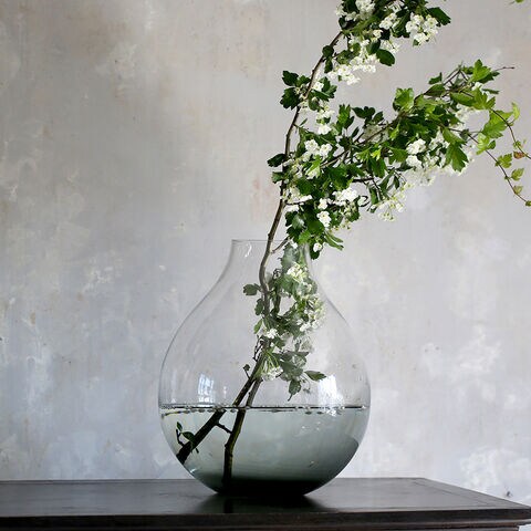 ベースのデザインは、下部に行くにつれて色が濃くなり、水や花の茎がガラスの色に溶け込むように見えるため、まるで「自然」と「作品」が一体となっているかのような独特の佇まいが特徴です。