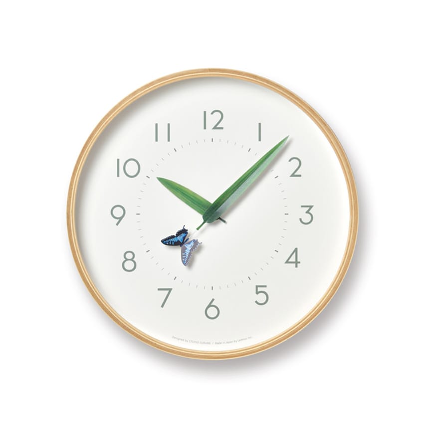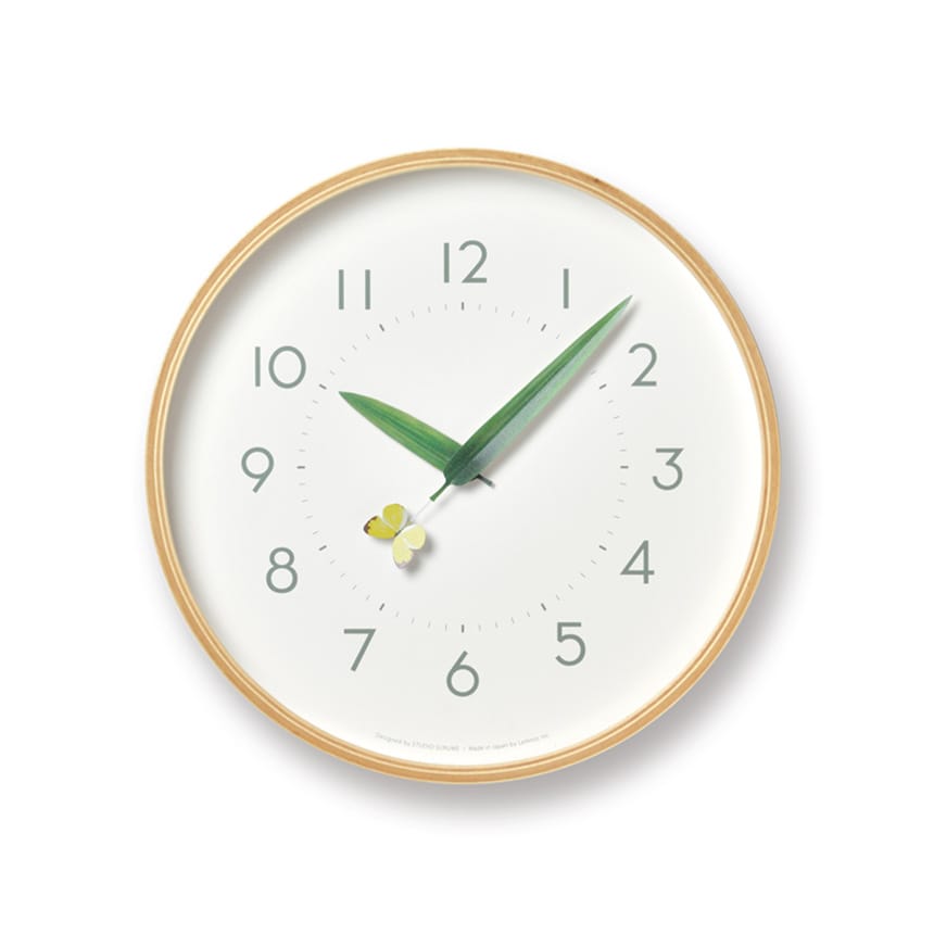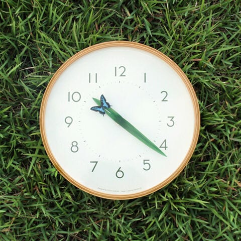 「とまり木の時計」は分針と時針が交差する1時間に1度、葉っぱの上で昆虫が羽を休めるというユニークなデザイン。