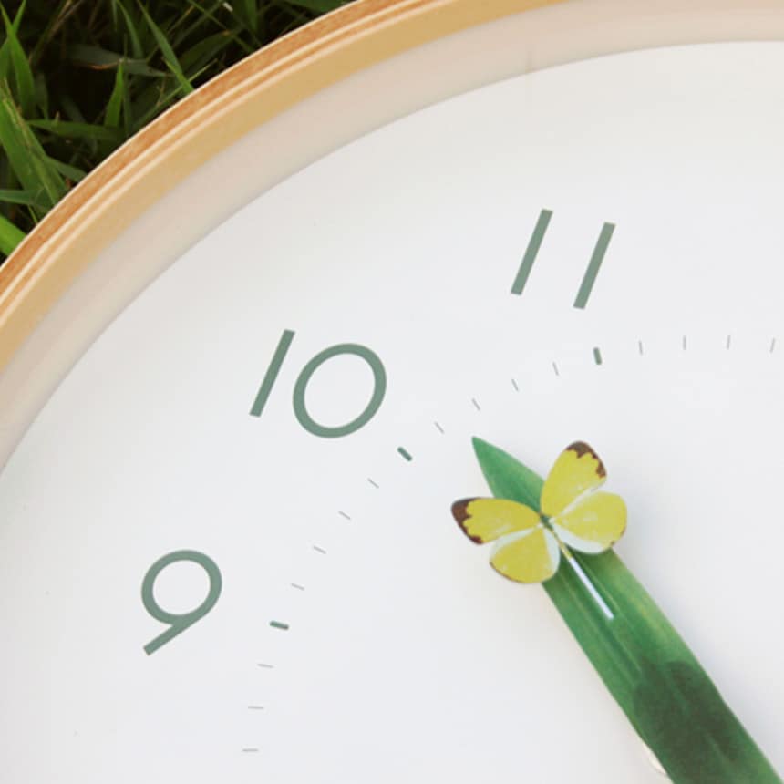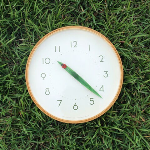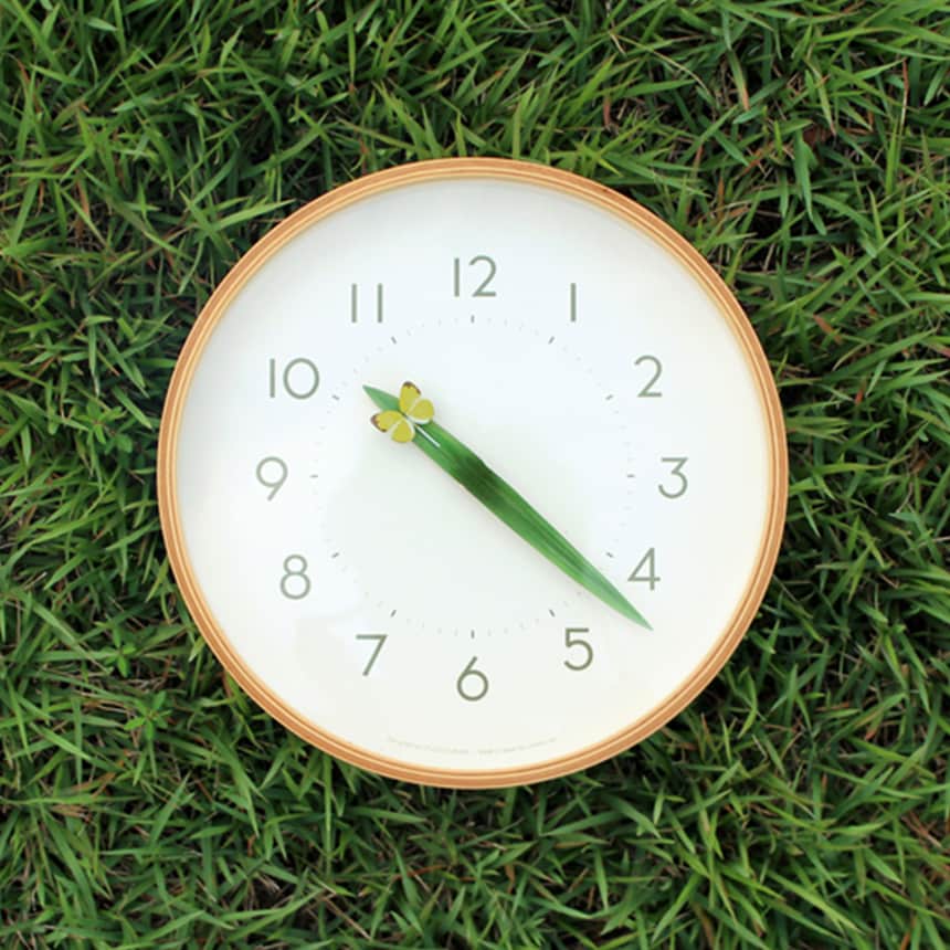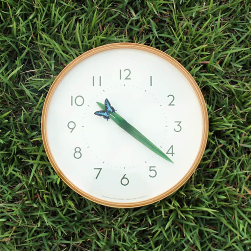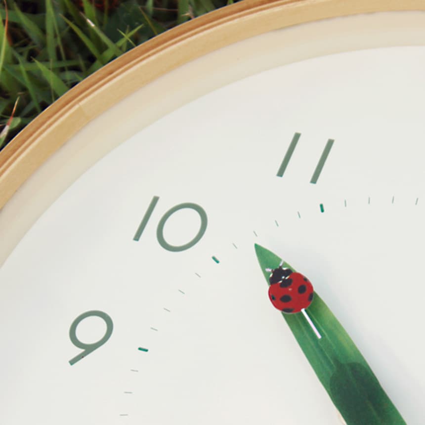 時計の針が葉っぱと昆虫に見立てられ、シンプルながらも心温まる物語を演出します。